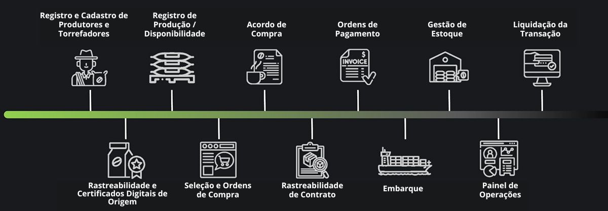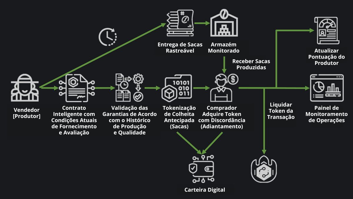 A plataforma de comercialização de cafés da cooperativa monitora produção, estoque e vendas com rastreabilidade via blockchain, registrando cada etapa do ciclo do café, bem como certificados e relatórios de origem.